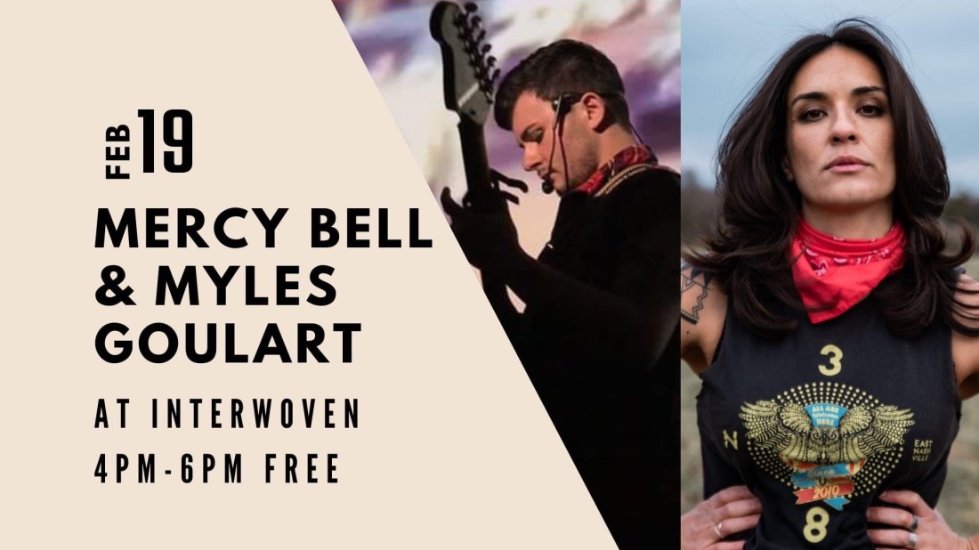 An audience of nearly 40 filled the cozy and intimate Interwoven maker space last Sunday, February 19th, to hear sets of solo acoustic music from Mercy Bell and Myles Goulart. It was the year’s first installment of the Unexpected Music Concert Series.